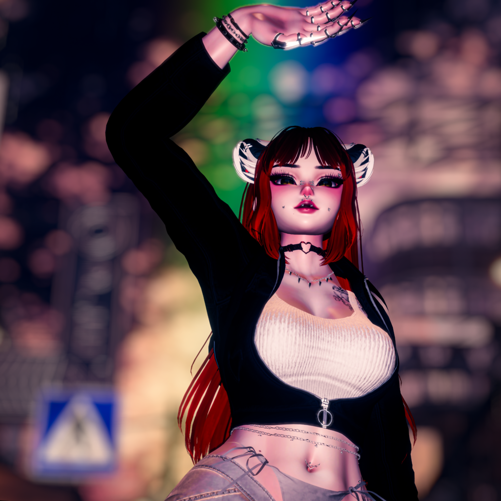Body, Head (edit&makeup), eyes, hair 1, hair 2, hair 3, Ears/Tail, Bellychain, face piercings, septum, belly piercings, Choker, Bracelets, Claw nails, heels 1, heels 2, halter top, leather jacket, jeans, bikini, heart bag, hoop earrings, star earrings, pants, Skirt, rings 1, rings 2, ripped paper, cropped shirt, shorts, fishnets, amigu piece, tattoos, Kitty plush, Icons, necklace